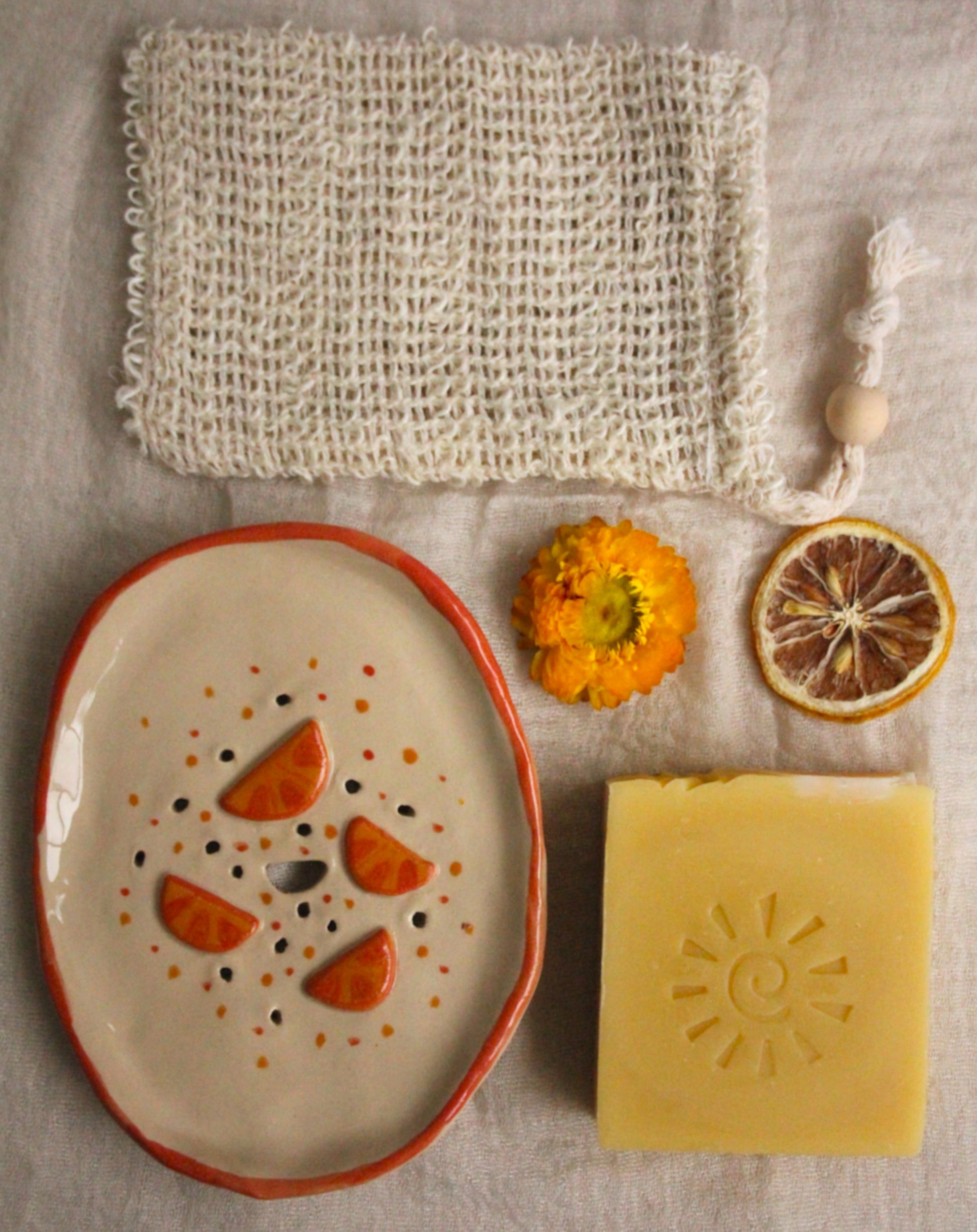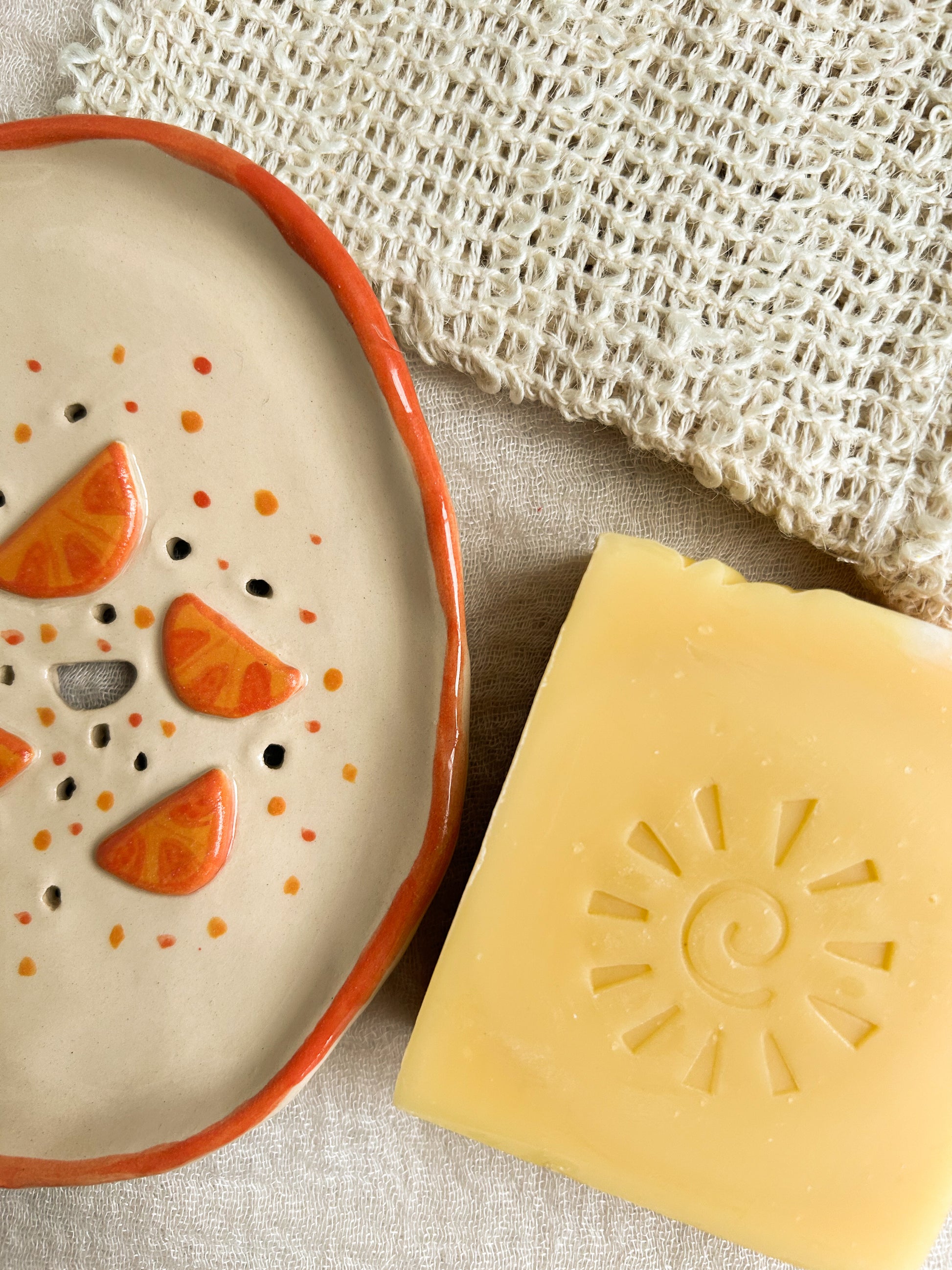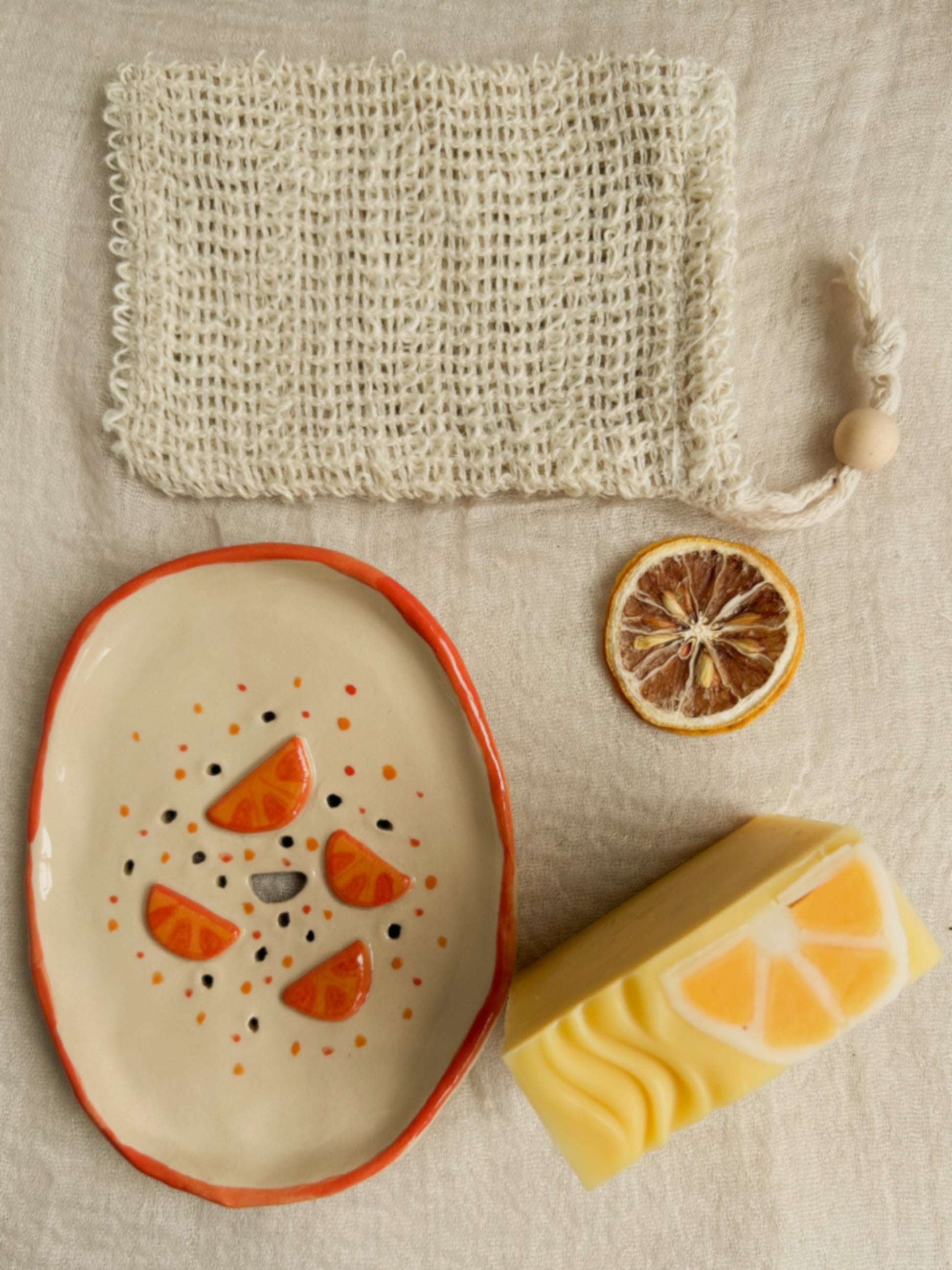 Pachet săpun natural cu gălbenele, cătină și portocale și săpunieră din ceramică @Fata cu Lut în Păr
